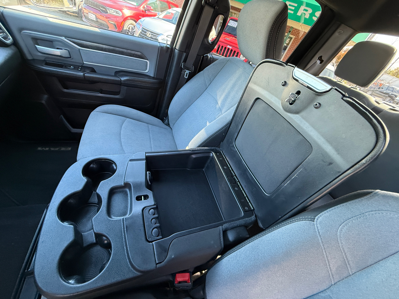 Front 40/20/40 split bench seat with fold-down center console with cupholders and storage
